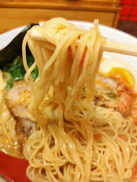 暫く待ち登場、早速頂きます、中々特徴的なスープと麺です、好みは分かれるかも知れませんが、ネギと紅ショウガが正義!みたいな味でした。