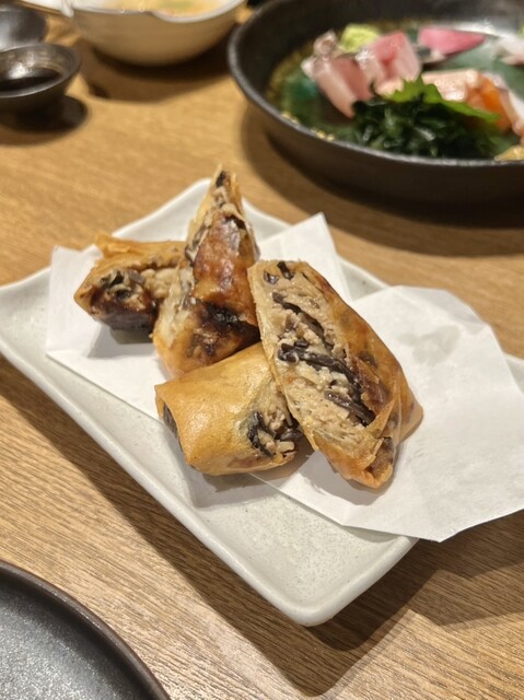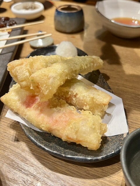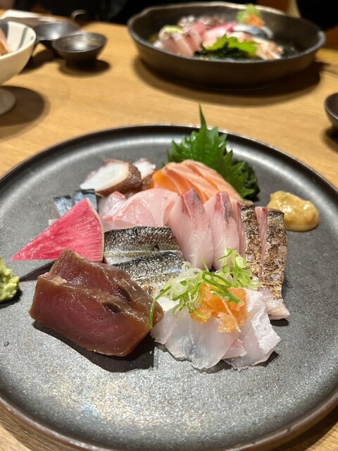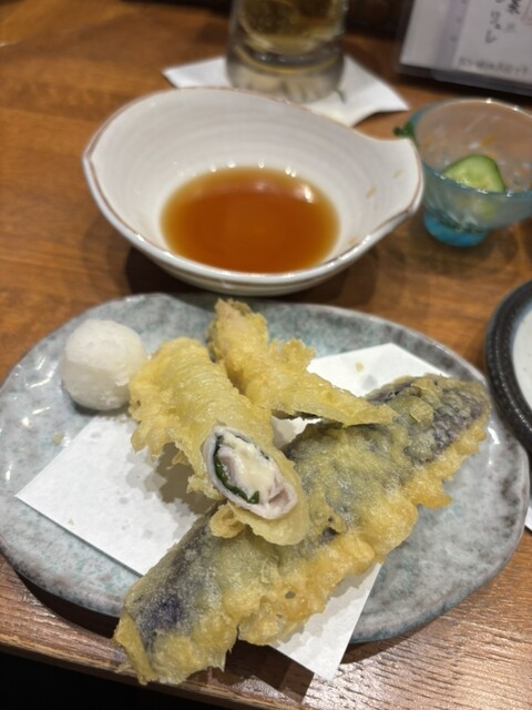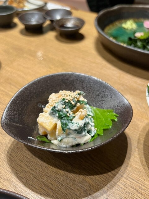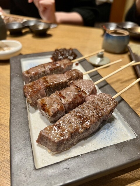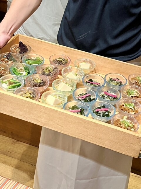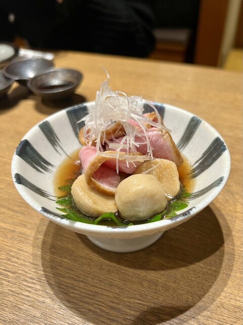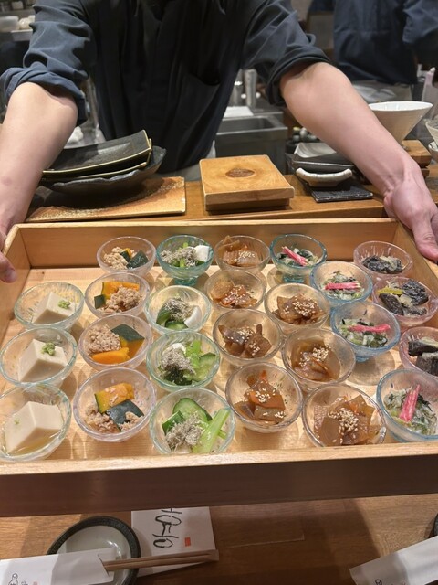 お通しが選べるのが毎回楽しいなぁと思います。ちょうどよい小皿感で可愛い。行くたびに内容も季節により変わっているので、ちょっとした楽しみです。日本酒の種類が豊富で、グラスで手頃な値段で色々飲み比べできて良い感じ。 ⭐︎6種類くらいから選べる付きだし ⭐︎肉寿司…山葵、塩、醤油で お肉が柔らか... 詳細を見る