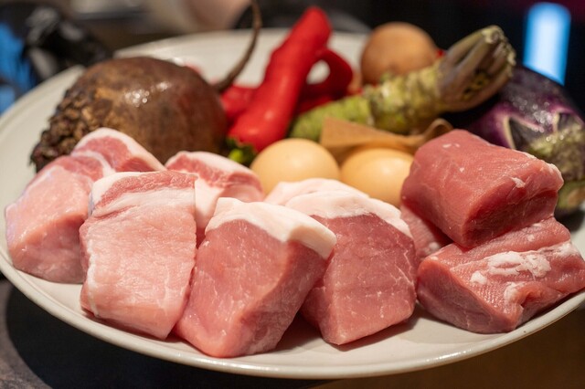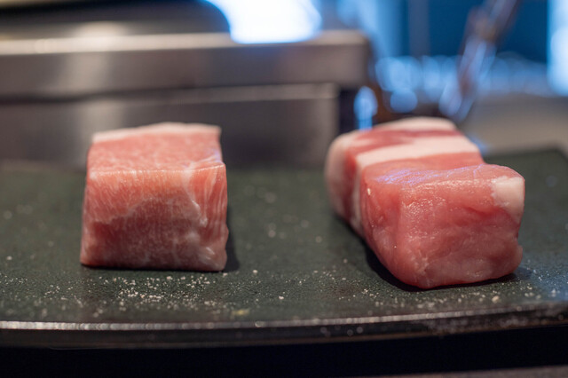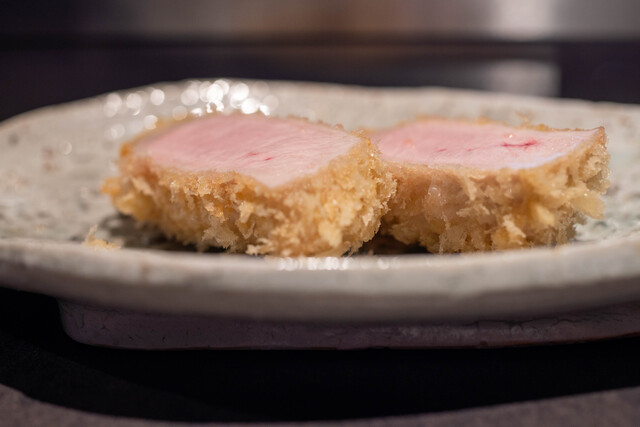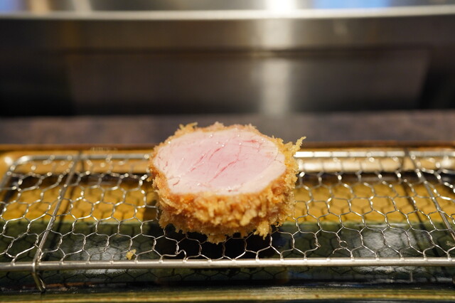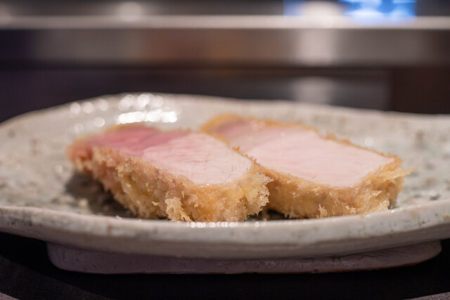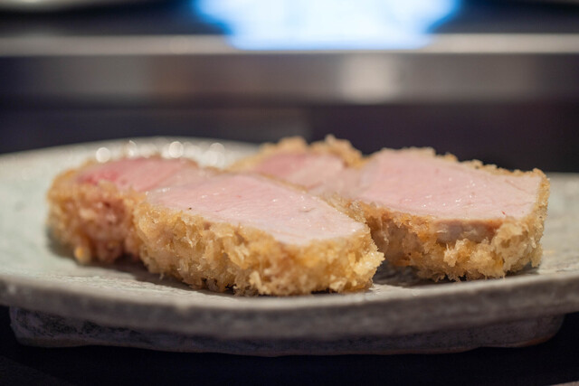 とんかつは低温調理の白いトンカツで中はレアのタイプ。お肉は、ヒレ、ロース、リブロースの順番で提供されます