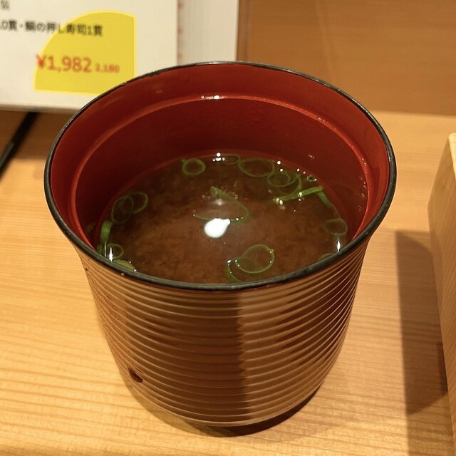 小鉢に赤だし、にぎりが7貫に鯛の押し寿司、