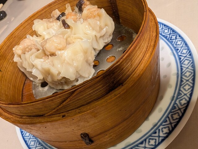 貝柱粥、スペアリブ、エビのライスペーパー巻き、杏仁アイス、卵あんの饅頭。