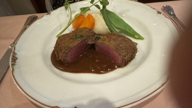 それに、スペシャリテっぽい雰囲気のビーフシチューと、牛カツレツの3皿。スープと前菜・サラダのコースセットとドリンクで、2.5万円/人。