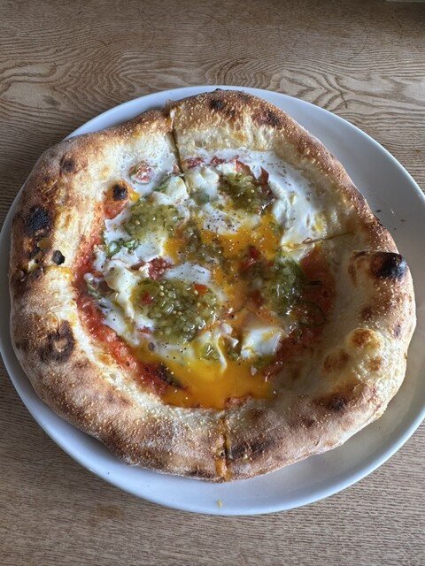 ピッツァは青とうがらしと半熟卵。
