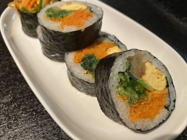 今日は目の前で焼いてくれるチヂミ、巻いてくれるキンパ、揚げたてのヤンニョンチキン、ナムルなどの副菜