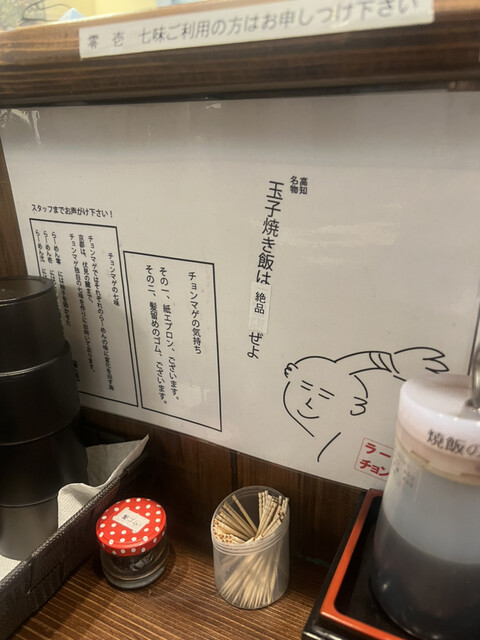 たまご焼き飯、らーめん零(塩)、壱(醤油)・弍(味噌)・限定ラーメンをひっさげた高知発の、らーめん店でございます。この度、"チョンマゲさんのはなれ"として限定ラーメンを取り扱い、兵庫県の皆様に高知発ラーメン、焼き飯を知って頂きたいと存じます。 |