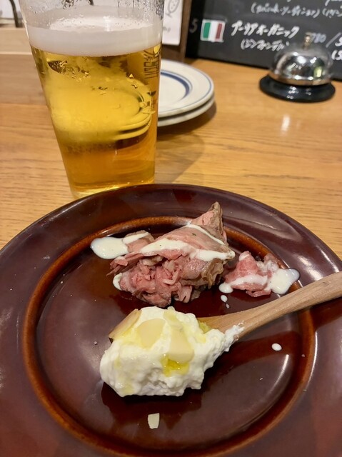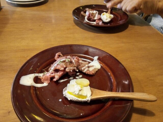 突き出しで、ローストビーフとババロアが出てきました。上等なオリーブオイルと塩で食べるババロアはクリーミー。柔らかいローストビーフにかかったガーリックソースも美味しい。これならテーブルチャージ取ってもイイですよね。