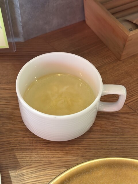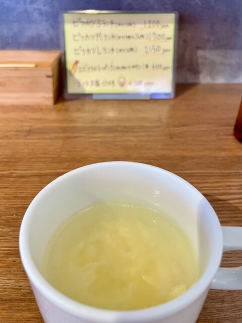 カウンターから先にお水のあと、たまごスープがカップ...