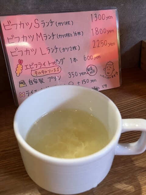 こちらはビフカツ専門で、メニューはビフカツのSMLの3サイズ展開と、エビフライのトッピング、あとはデザートのプリンとなります。