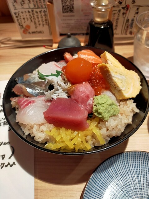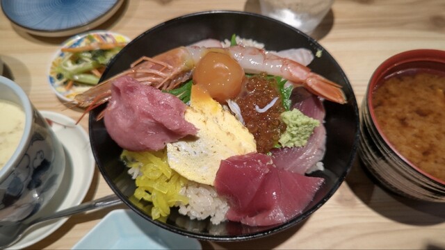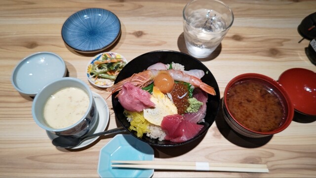 人気の海鮮丼を注文。赤だしと茶わん蒸しと一品がついていた。