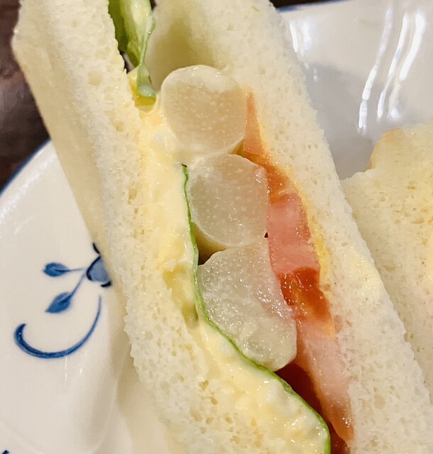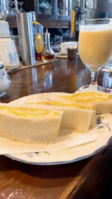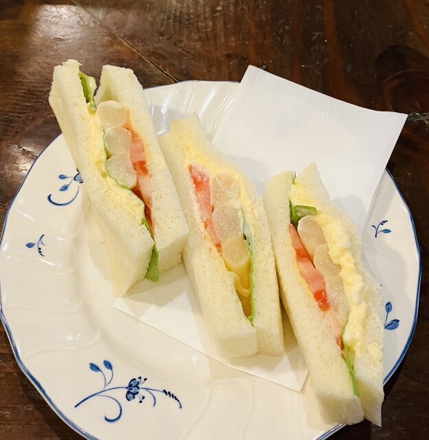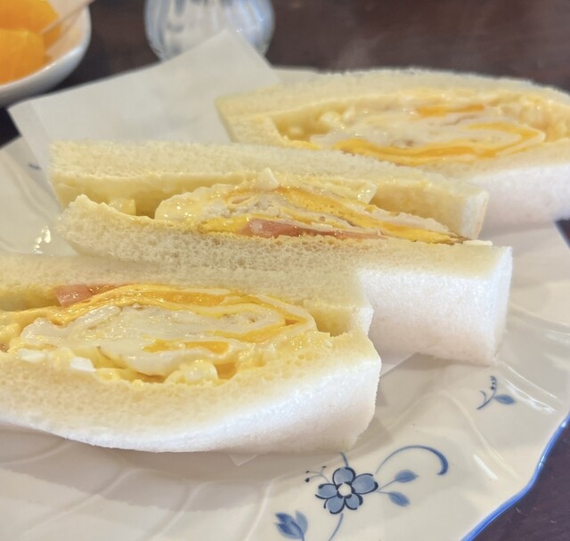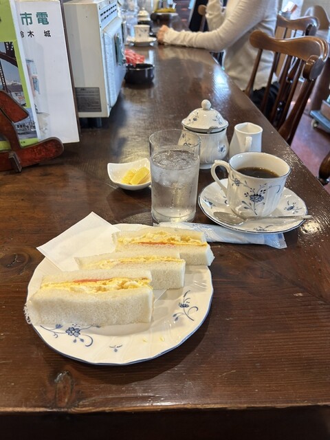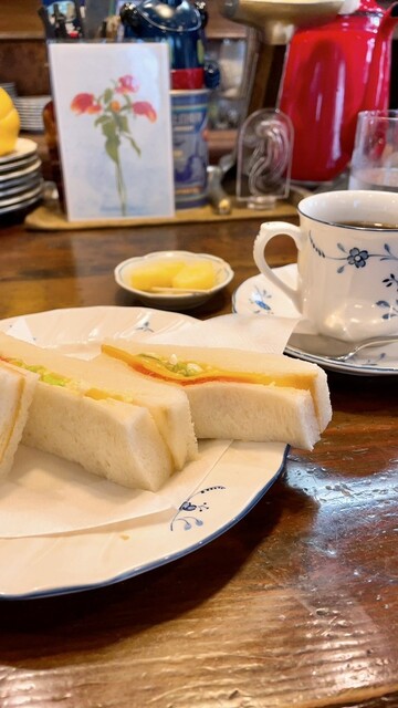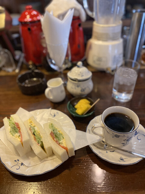 今回はモーニングメニューのコーヒー(HOT 450円)とハーフサンド(ドリンク料金+250円)をいただきました。ハーフサンドはハ...