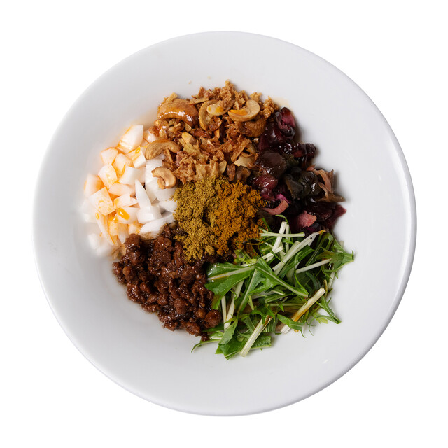自家製スパイスラー油だけでも20種類以上使用。具材は神戸ポークの肉ミンチや淡路島の玉ねぎ、インドから仕入れるカシューナッツ、柴漬けが良いアクセントに。
