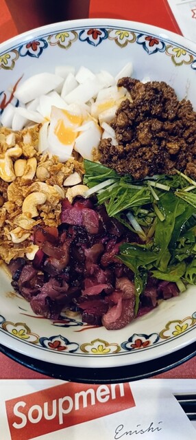 神戸に行った時に、ふと担々麺が食べたくなって食べログさんを検索。有名なENGSHIさんのメニューを見ていると‥。 《まずはコレ!!》担担麺 中辛 「約20種類のスパイスを使った辣油」をベースに、さらに約32種類の食材とスパイスとタレに、全粒粉・挽きぐるみ粉などを合わせた平打ち麺を混ぜ合わせました... 詳細を見る