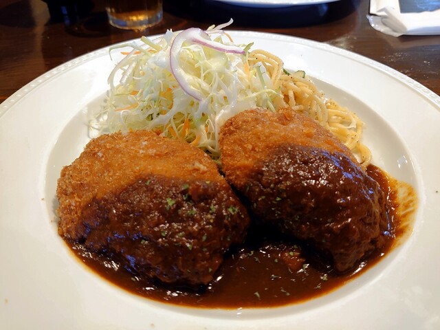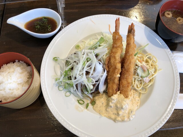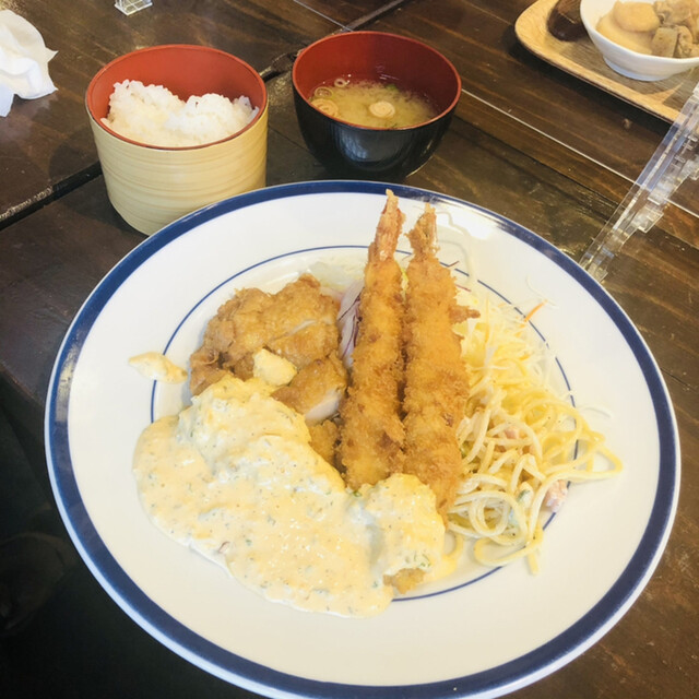 ハンバーグ&海老フライセットに目玉焼きトッピングで