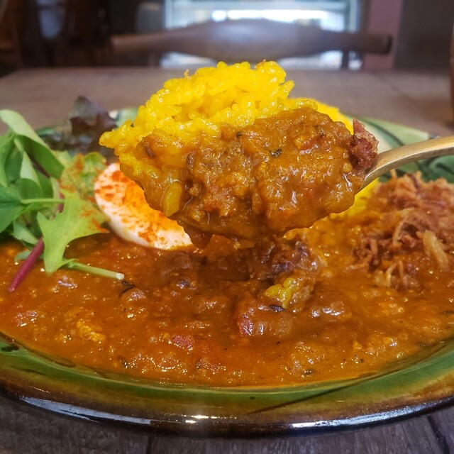 定期的に食べたくなる こちらのあらびきチキンカレー パクチー苦手と伝えると、ほか野菜に変えてくれます 毎回、 ルーもご飯も大盛り頼むんだけど、見た目より凄くボリュー... 詳細を見る