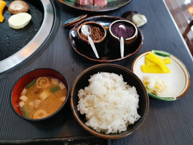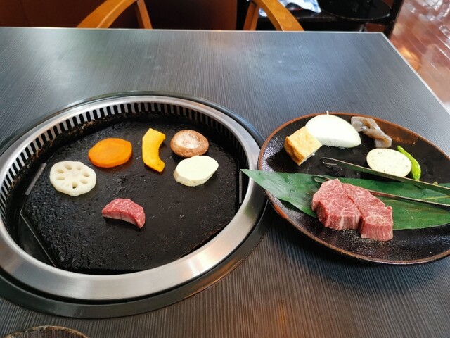 ステーキは自分で焼くスタイル。石焼を売りにはされており、そこそこの金額なので職人の焼きで提供されると思っていたのですが、自分の好みで焼くスタイルでしたので、個人的には残念。