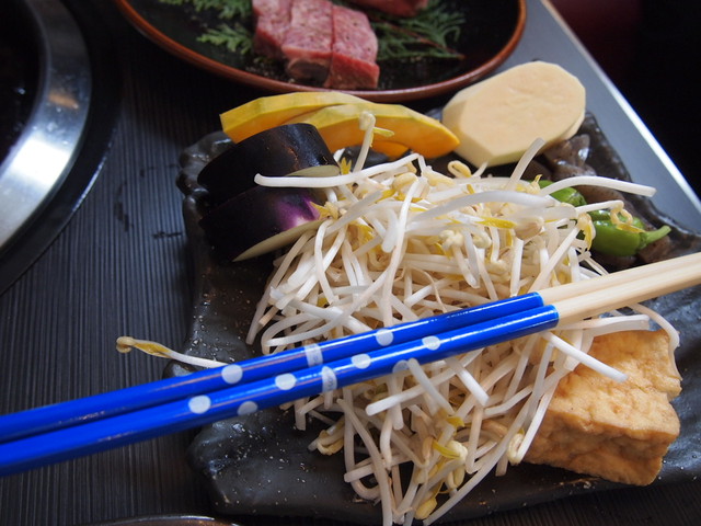 薬味は、ポン酢・塩・辛子醤油。溶岩石の遠赤外線効果で、表面が焦げすぎることもな