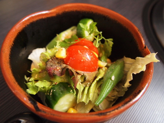 石焼ステーキランチ¥2,500円のコースには、オクラやハルサメの入ったグリーンサ