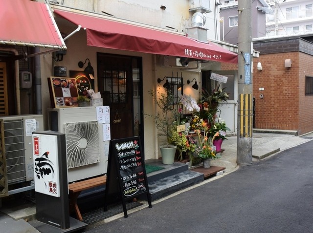 エンジ色の庇テントの店舗で、韓国料理と云うよりは、カフェかダイニングバーって感じの佇まい