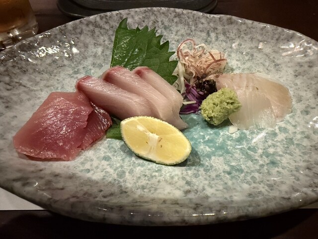 お刺身やら一品、揚げ物、焼き物と一通り出てきた。いわゆる会...