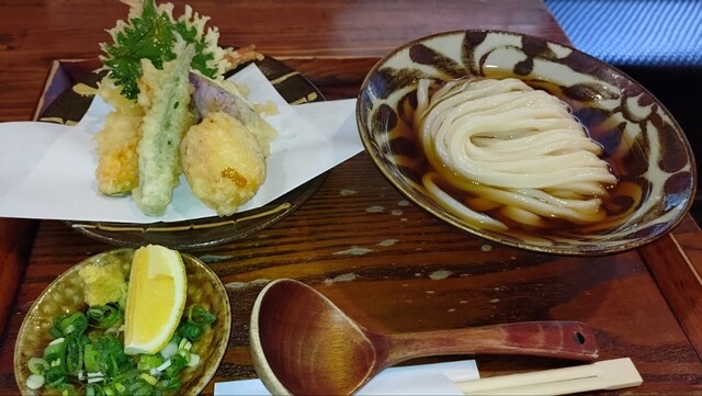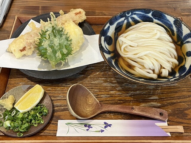 さて頂いたのは『但馬どり天うどん』(1,100円)と『ヒジキの五目いなり』(300円)。