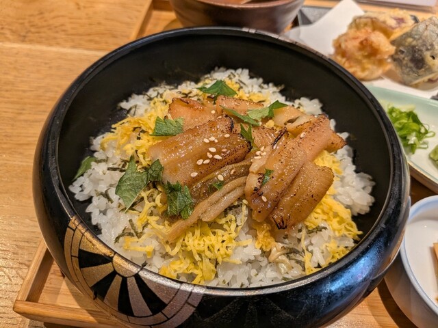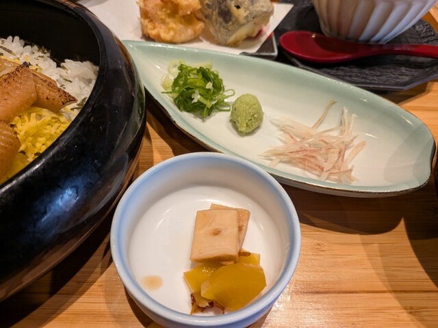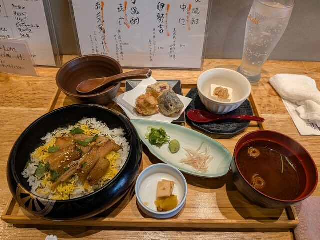 "穴子のひつまぶし御膳" とノンアルコールの"柚子ソーダ"を頂きました。 お友達が注文したお昼の日本酒4種飲み比べの冷酒も少し味見させてもらって楽しいランチが出来ました。飲み比べは沢山有る中から気になるのを選べるので楽しかったです。
