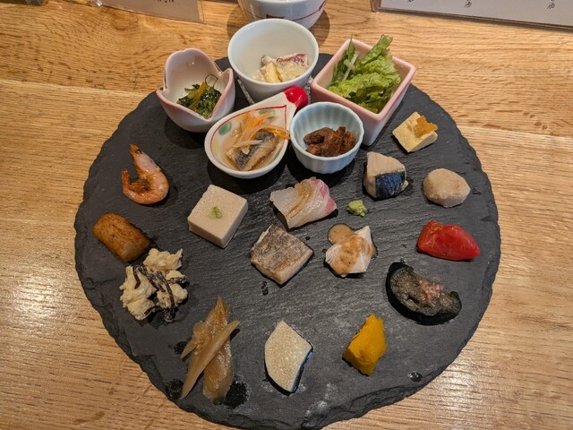 海のご馳走、山の恵みを少量多種で盛り合せたランチ「朔彩御膳」