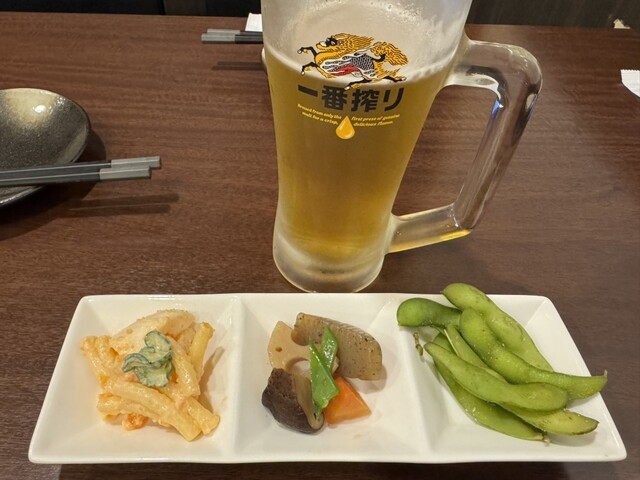 久しぶりに会社の同僚と3度目の訪問。同地区は飲食店が少なく、周りは住宅街や農家の方たちが多い地区。店内は広く先客3名さんが先にカウンターで食事の様子。ほろ酔いセットはドリンク2杯と付き出しがついて千円をまず頼み、あとはビールや日本酒を飲みながらとんぺい焼きやイカ炒め、などおつまみ頼み、締めはオム焼きそばとお好み焼きを注文。若干強面だけど実は気さくなマスターと可愛らしい奥様が切り盛りされてます。料理...