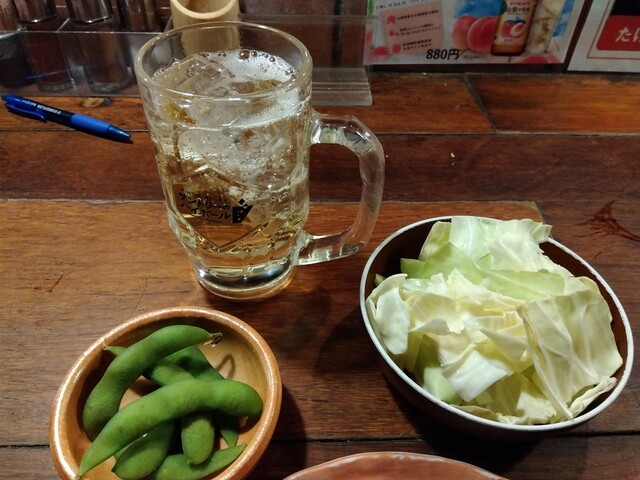 突き出しは枝豆とキャベツ。