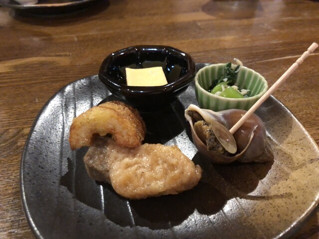 こだわりの付き出しからスタート。新鮮な海の幸を様々な調理法で