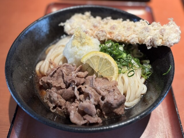 コシのあるうどんに甘辛く煮た牛肉の旨味がしっかり絡む。竹輪天はサクッと香ばしく、半熟玉子天を崩せばまろやかさが加わり味が一変。
