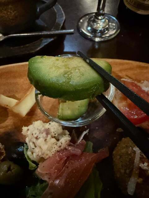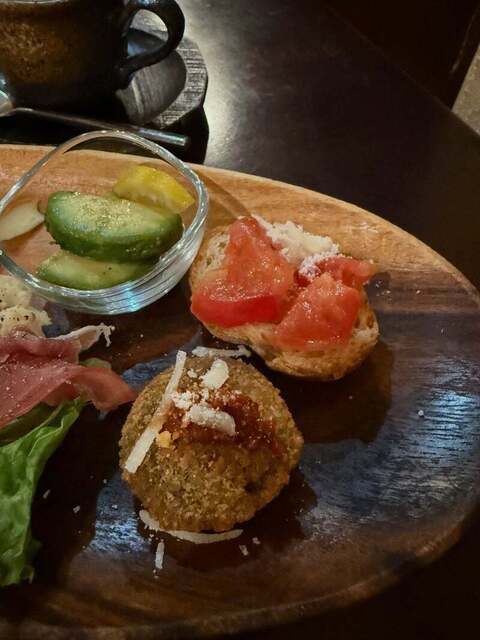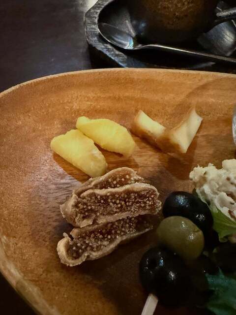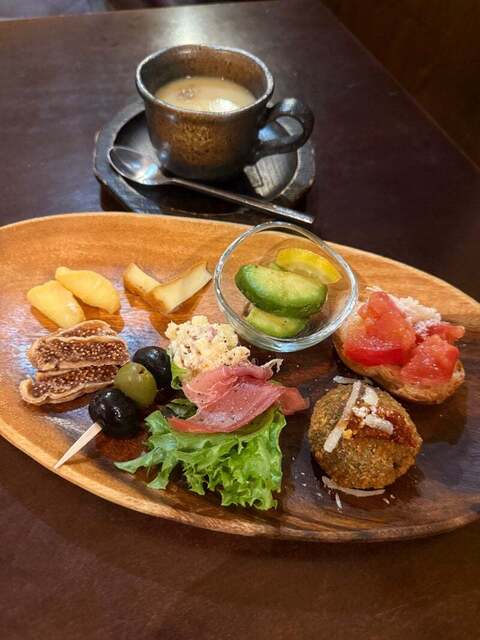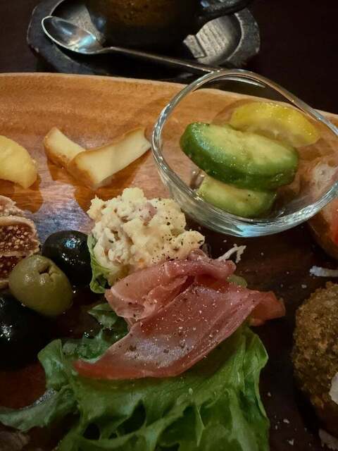 いぶりがっこチーズ、イカ墨リゾットコロッケ、ピクルス、生ハム、オリーブ、チーズなど。
