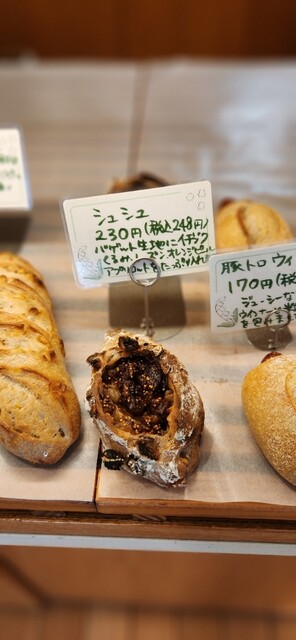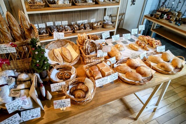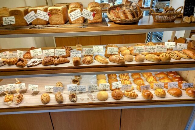 先日木曜日の16時頃に伺った際、店内には多くのパンが並んでいましたが、既にいくつか売れてしまった様子でした。こちらのお店は、2020年と2022年に食べログのパン百名店に選ばれており、その実力がうかがえます。パンのサイズ感や商品名が書かれたプレートがとても可愛らしく、見た目からも楽しめるポイントです。