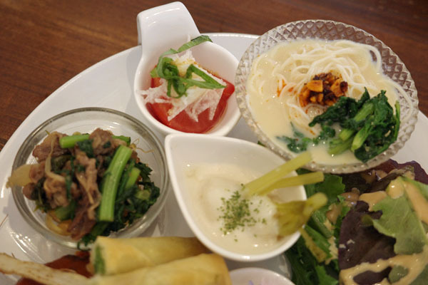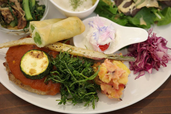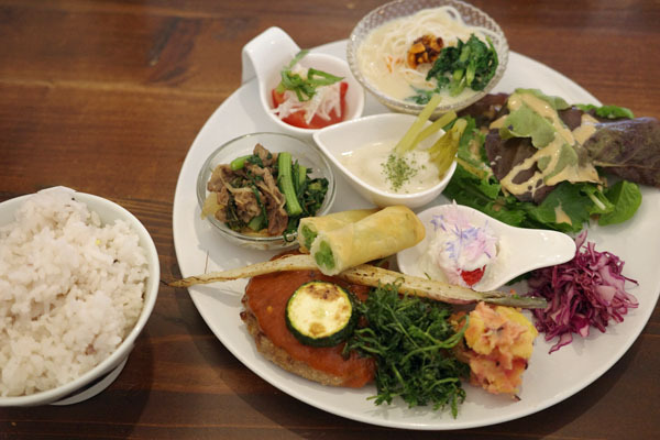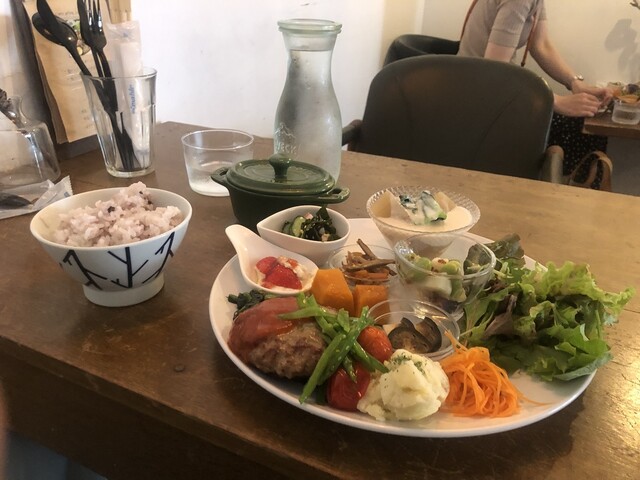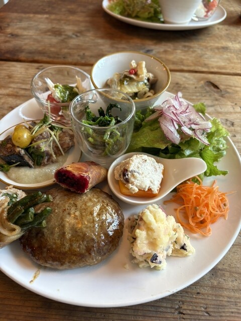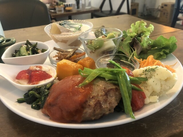 ランチメニューは、3種類から選べるメインに副菜がいろいろのっているプレートが1200円。メインはハンバーグにしました。