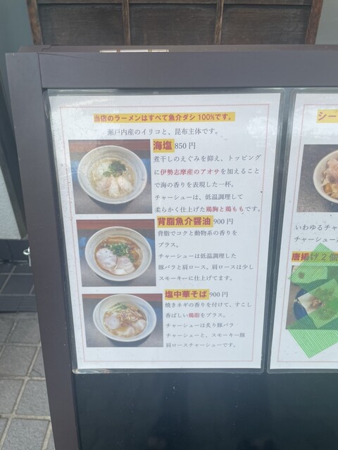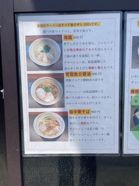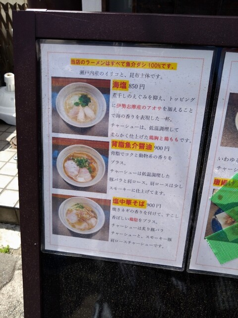 海塩を注文。スープは透明感があり、メニュー名の通り海を感じる磯の風味。塩に丸みがなく少し尖った塩味に感じたが、すっきりさっぱりした味で好みは好み。