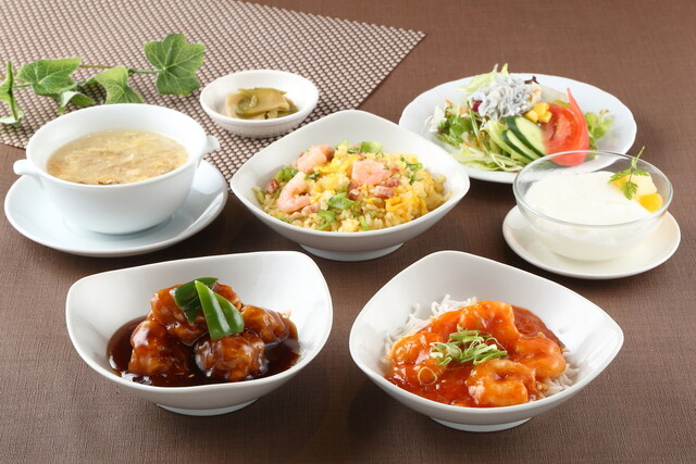 2品選んで、限定20食の蒸しチャーハン、スープ、サラダ、ザーサイ、デザートの胡麻団子に、プリンが付いてコスパは良い。