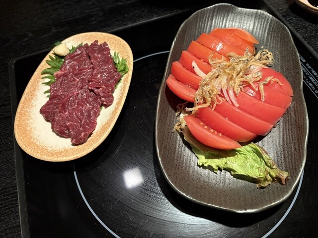 馬刺しと焼きもつも注文。どちらもお酒が進む美味しい一品だった。