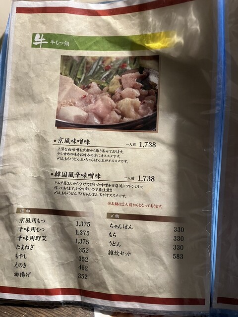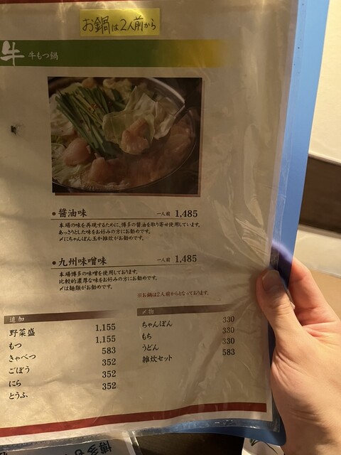 今回注文したのは、九州味噌味のもつ鍋を二人前。まずスープを一口いただくと、味噌のコクがありながらも重たさはなく、にんにく感がありながらも後味がすっきりしていてとても好みでした。もつは下処理が丁寧で、臭みは一切感じられず、ぷりっとした食感と甘みがしっかりあります。野菜との相性も良く、食べ進めるほどに旨味が増していく感覚でした。