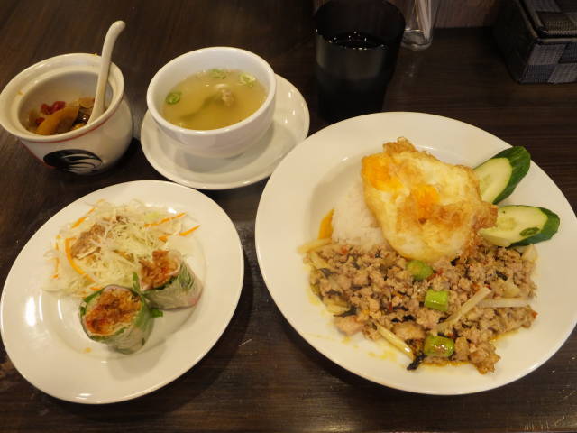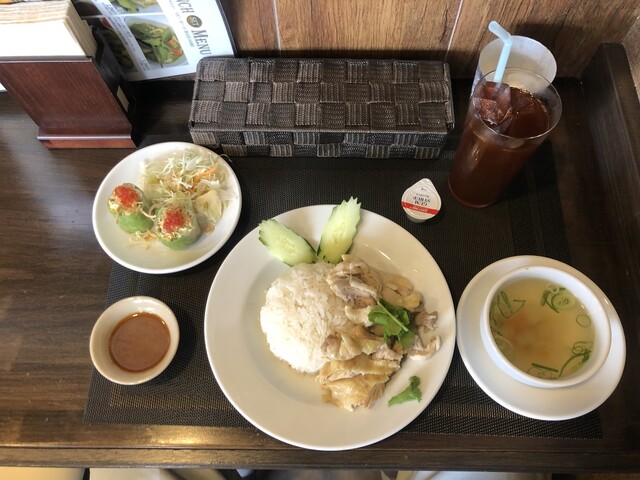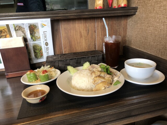 数種類あるランチメニューの中から「おすすめ」と書かれていた「カオマンガイセットMIX(鶏2種類)」を注文しました。茹でた鶏肉が乗っている通常のカオマンガイと、揚げた鶏肉が乗っている揚げカオマンガイの2種類が一度に味わえるお得なメニューで、スープ、生春巻き、デザートorタイティーのセットです。