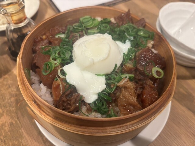 私は 牛すじ煮込みのせいろ蒸しご飯 半熟卵添え 、(見るからに美味しそう! 以前もこれ食べました♪)