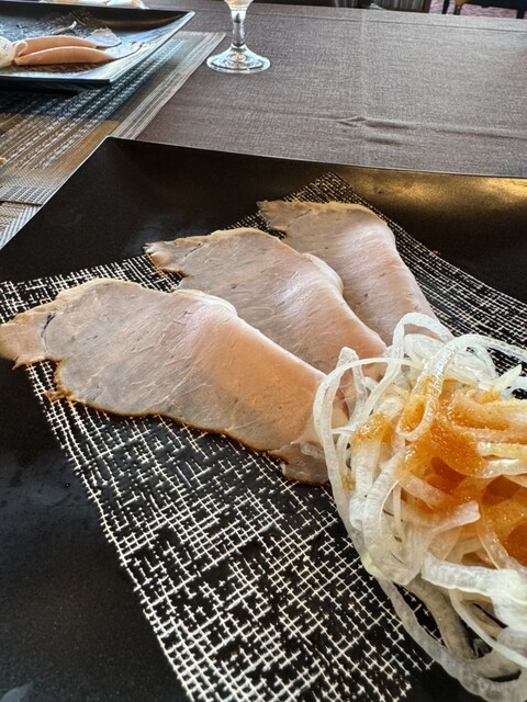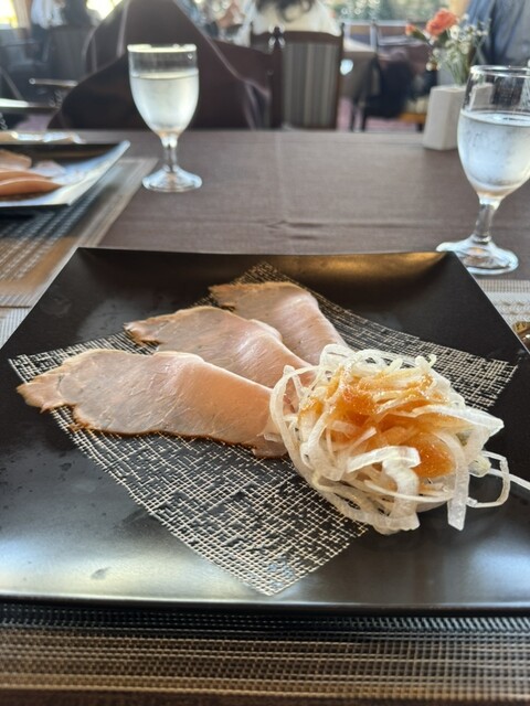 オニオンスライスを添えたオードブルは三田屋自慢のハムがメインです。