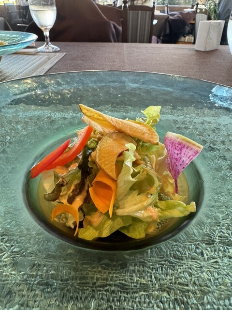 生野菜を使用したオレンジ色のオリジナルドレッシングがたっぷりかけられています。