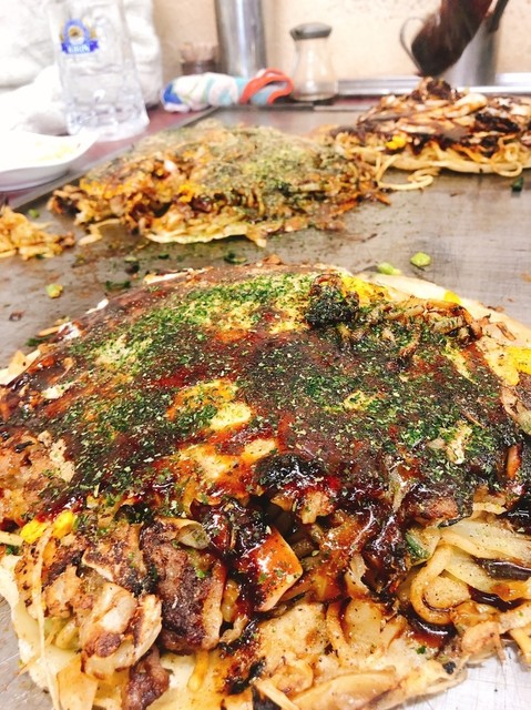 こちらは尼崎で評判のお好み焼き屋さんということで期待していたのですが、想像以上に活気があり、鉄板から立ちのぼる香ばしい匂いに入店直後から食欲をぐっと刺激されました。笑