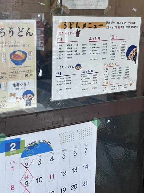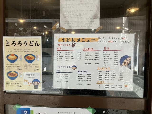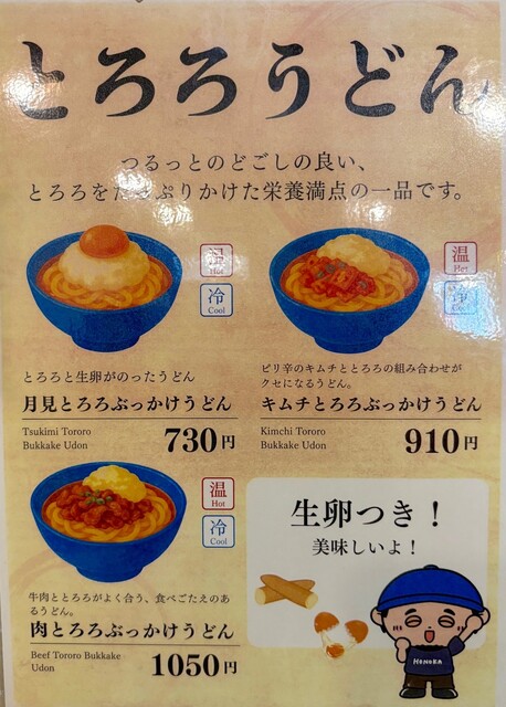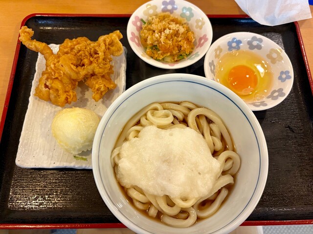○月見とろろぶっかけうどん(温)の半玉に、ゲソ天+半熟玉天〜初訪につき「ぶっかけ」、あまりの寒さに「かけ」かと思っていたのですが、”と...