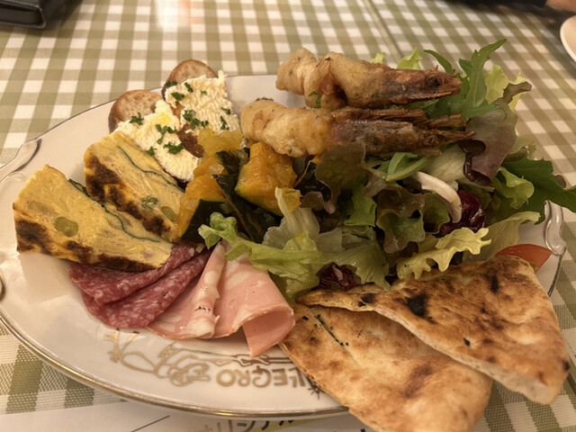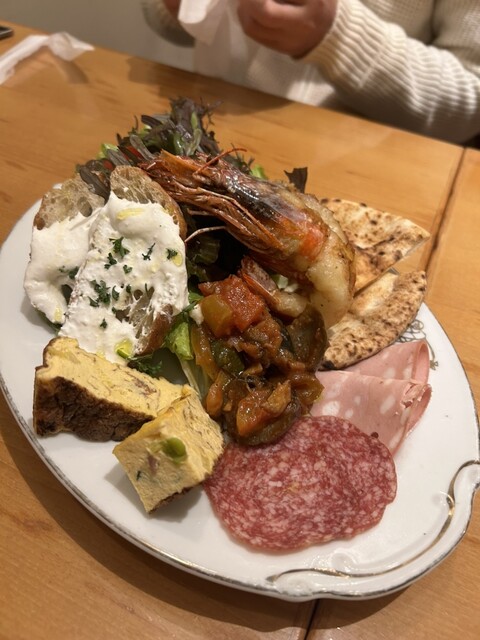 メニューはセットを注文して、オードブル盛合わせ、ピザ、パスタ、メイン、ドルチェでした。