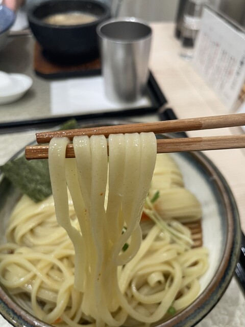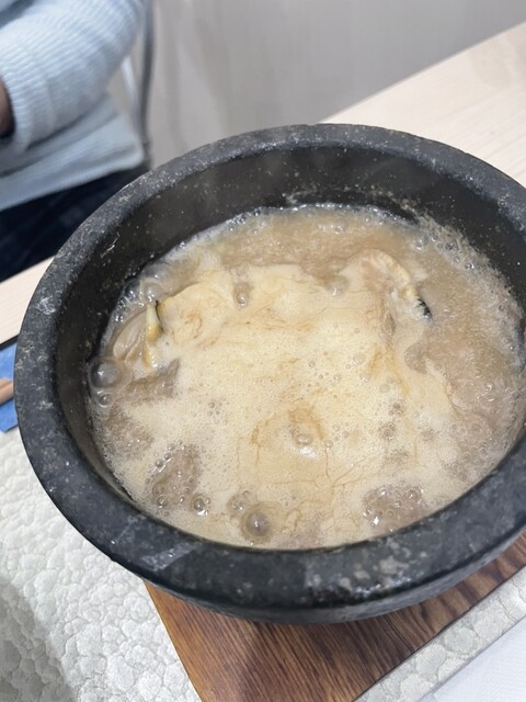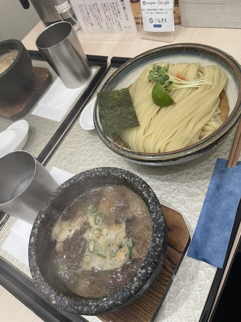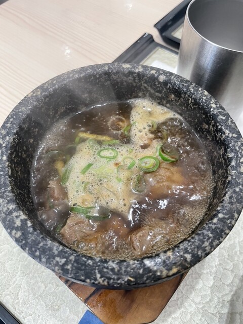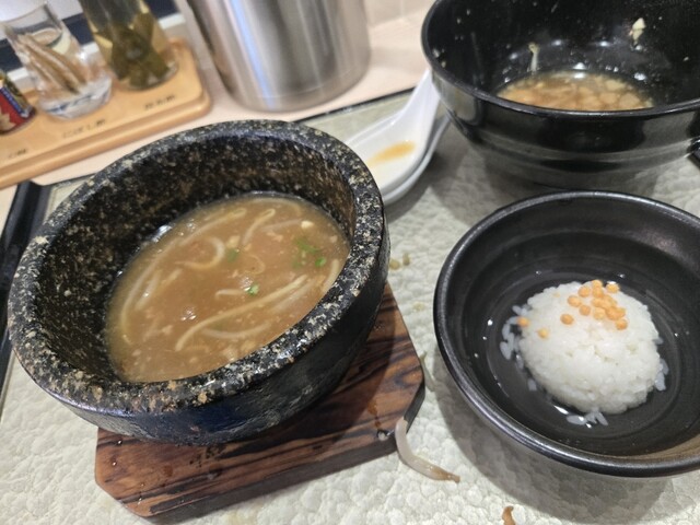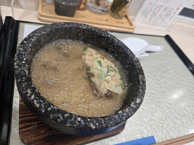 つけ汁は、アゴだしに数種類の醤油にザラメを配合してはるみたいです。器は、この店ならではの韓国産の石鍋で提供されます。最後まで熱々で食べてもらいたいとの事でグツグツに煮えたぎってきます。個人的には猫舌とちゃうの...