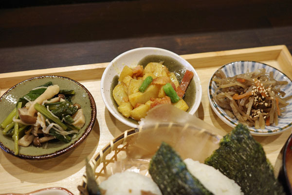 塩おにぎり2つにお惣菜3種、味噌汁が付いて850円+税。
