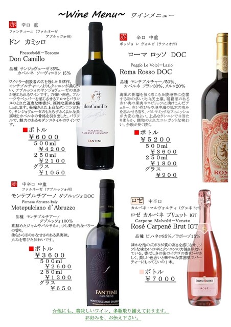 | ドリンク | 日本酒あり、焼酎あり、ワインあり、カクテルあり、ワインにこだわる |