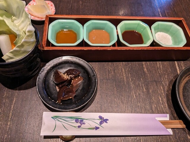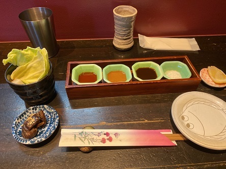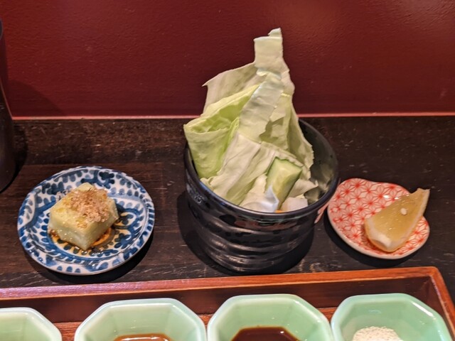 まずは薬味と小鉢、スティックサラダ、付出しが配膳。