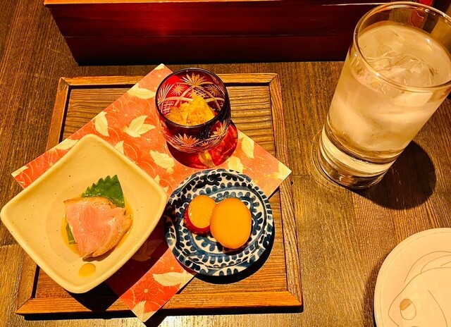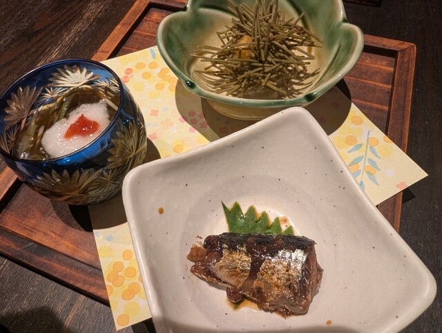 前菜は、もずくトロロ、秋刀魚の甘露煮、栗と海老のすり身の揚げ物で、この揚げ物は素麺...