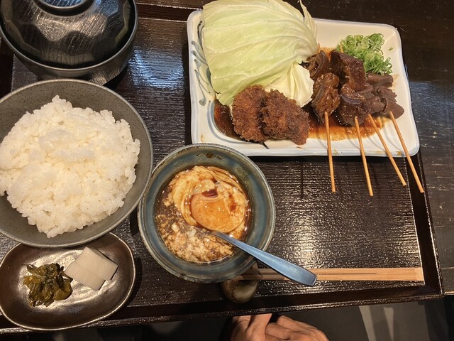 串カツ8種類、生野菜、汁物、香の物、ご飯。